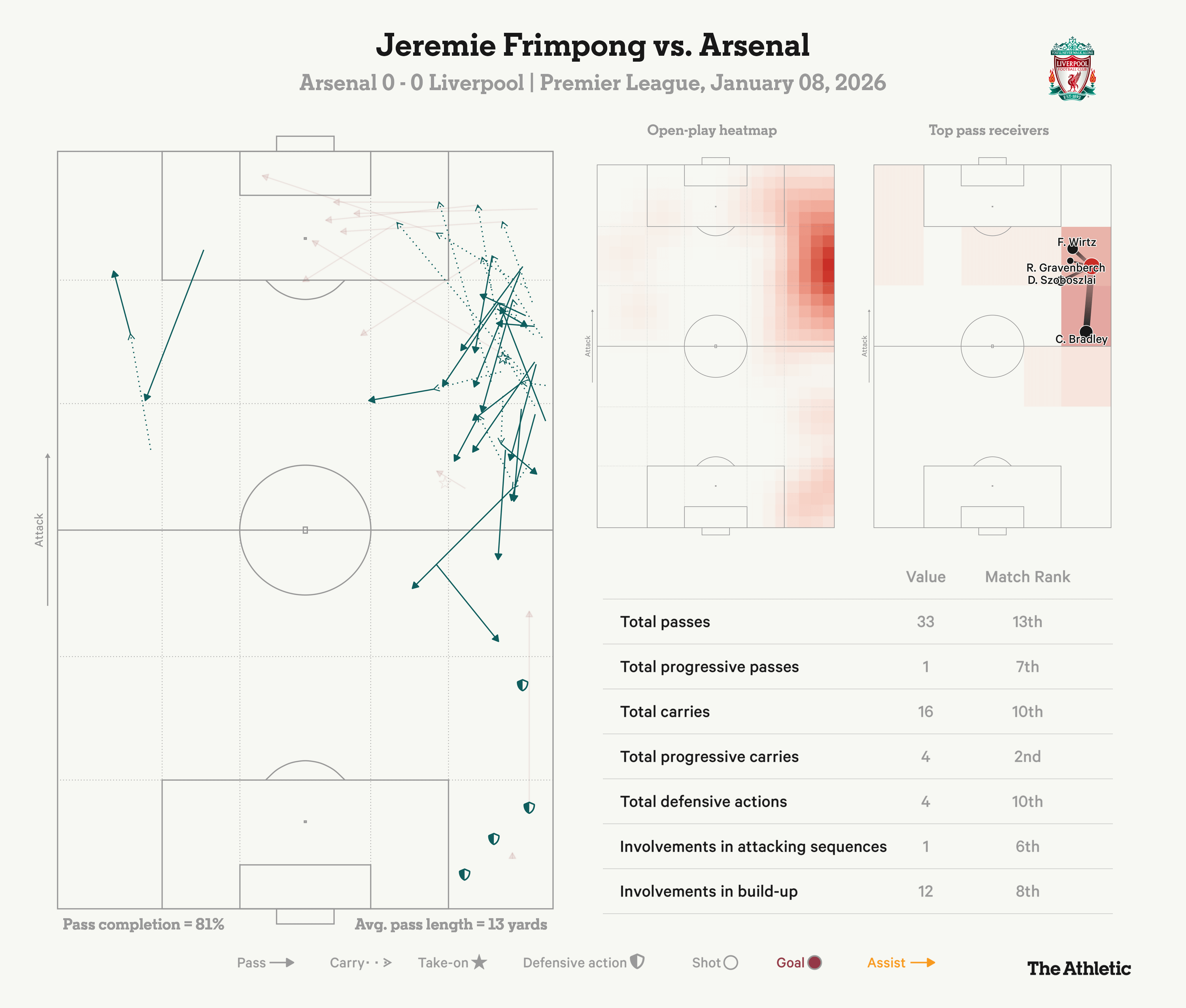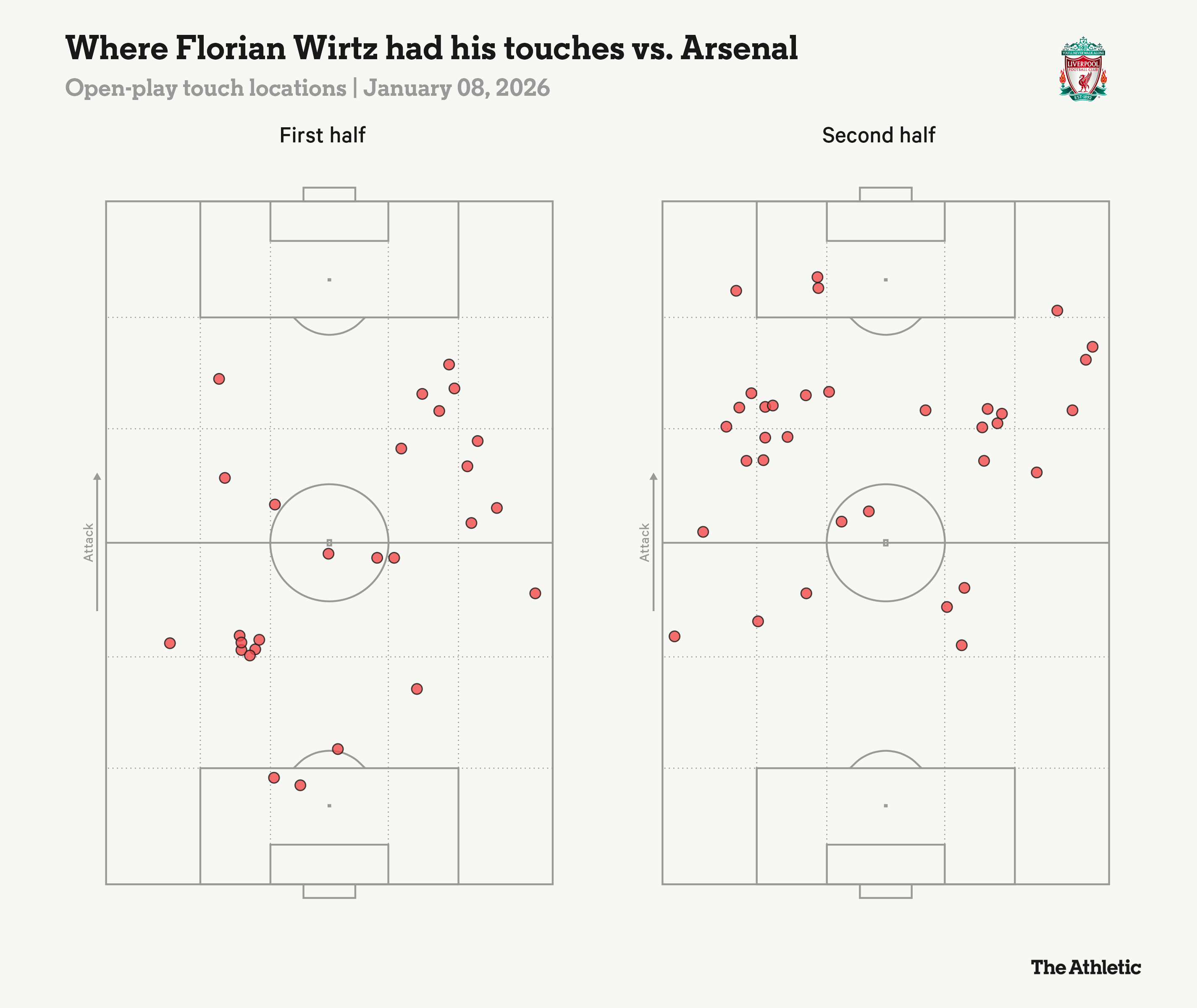 بدون مهاجم مركزي، كان ليفربول صريحًا بشكل غير مفاجئ، حيث سجل 0.36 هدفًا متوقعًا فقط، وهو أدنى رقم له هذا الموسم. ولكن من خلال الابتعاد عن دوره غير المألوف في خط الهجوم، ساعدت مجموعات خط وسط فيرتز على الأقل ليفربول على استعادة قدر من السيطرة وكسب نقطة رفع معنويات لم يتوقعها سوى القليل في البداية.