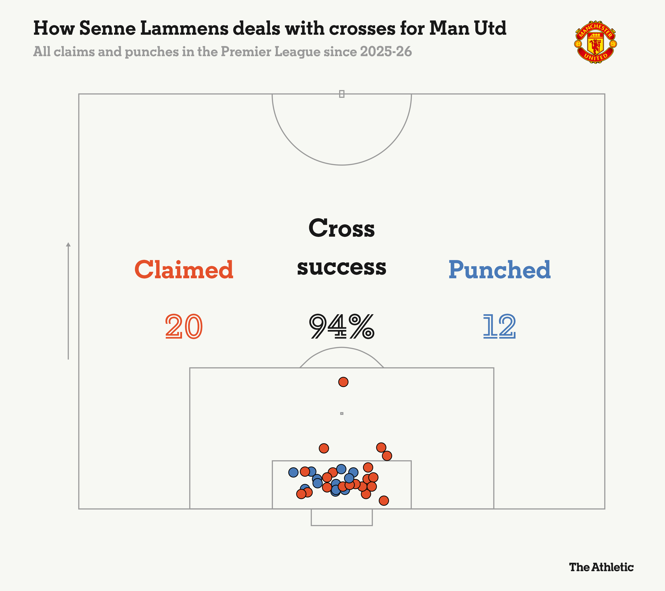 في المجمل، فاز إيفرتون بـ10 ركلات ركنية مقابل ركلة ركنية واحدة ليونايتد. لقد حاولوا تنفيذ 35 عرضية، وأكملوا خمسة. استحوذ Lammens على كرتين عاليتين بشكل نظيف ولكم أربع مرات أخرى بعيدًا عن الخطر – إجمالي التفاعلات الستة يحتل المرتبة الرابعة في مباراة واحدة هذا الموسم، وربما الأفضل من ذلك، أعلى مستوى مشترك من داخل منطقة الست ياردات.