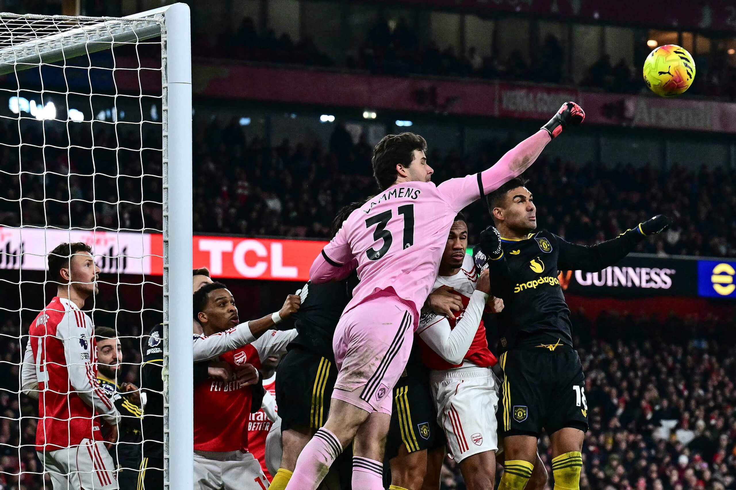 … فقط لكي يقاتل حارس مرمى يونايتد عبر حركة المرور ويضرب الكرة بقبضته اليمنى بعيدًا بخبرة.