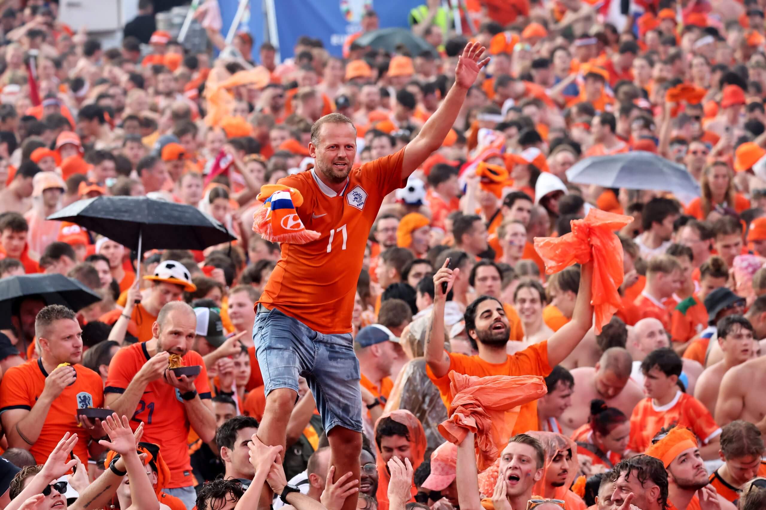 مشجعون هولنديون في حديقة المشجعين في دورتموند خلال نصف نهائي بطولة أمم أوروبا 2024 (كريستوف كوبسيل – UEFA/UEFA عبر Getty Images)