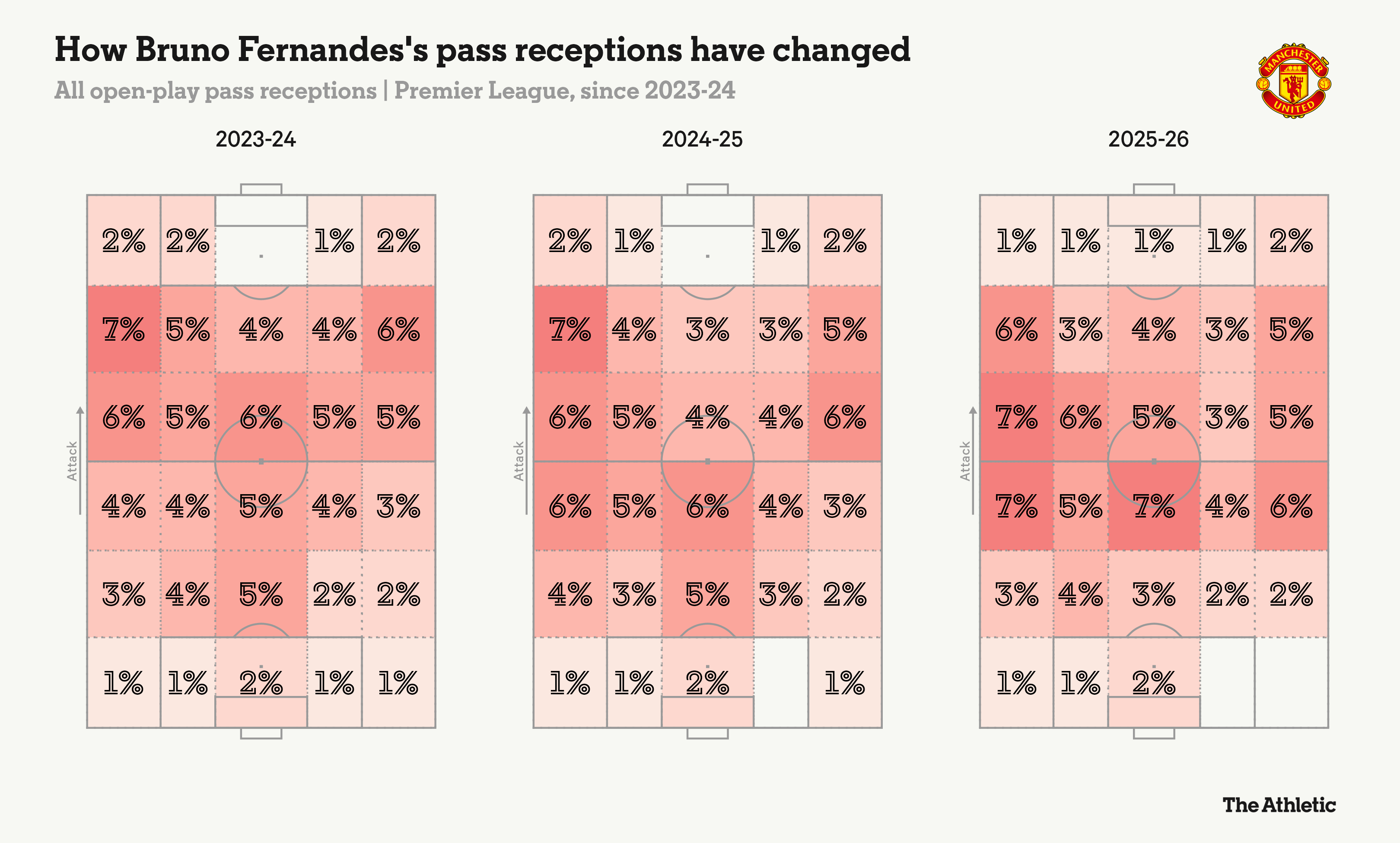 الأرقام حول لمساته في الثلث الهجومي تتبع أنماطًا مماثلة، ومع ذلك لا يزال فرنانديز فعالاً في تقدم يونايتد للأمام بينما يقدم شيئًا ما في خط الوسط. كما يوحي الرسم البياني أدناه، لا يوجد تغيير كبير في استقبالات التمريرات، ولكن من الواضح أن فرنانديز يعمل أكثر في الثلث الدفاعي من ذي قبل. يشعر أموريم أنه، في مبيومو وكونها وماسون ماونت الصاعد، لديه المزيد من الخيارات للمركز رقم 10 الذي يمكنه مساعدة فرنانديز في التأثير على المباريات.