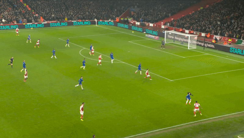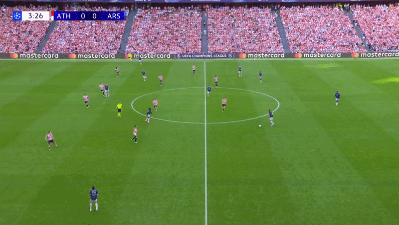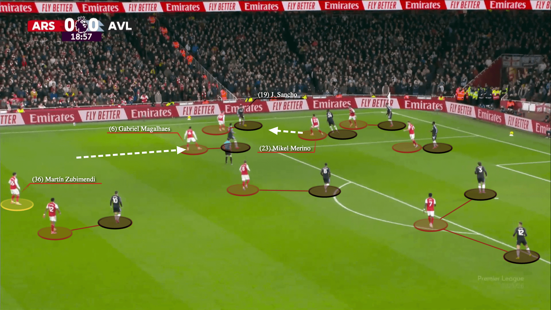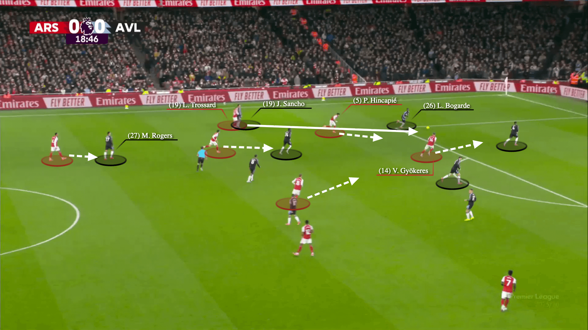 أرسنال يحاصر فيلا من الراية الركنية. قام فريق أوناي إيمري ببعض التمريرات معًا دون هروب، وعند هذه النقطة يتم محاصرة سانشو في واحد مقابل اثنين من قبل ميرينو وتروسارد.