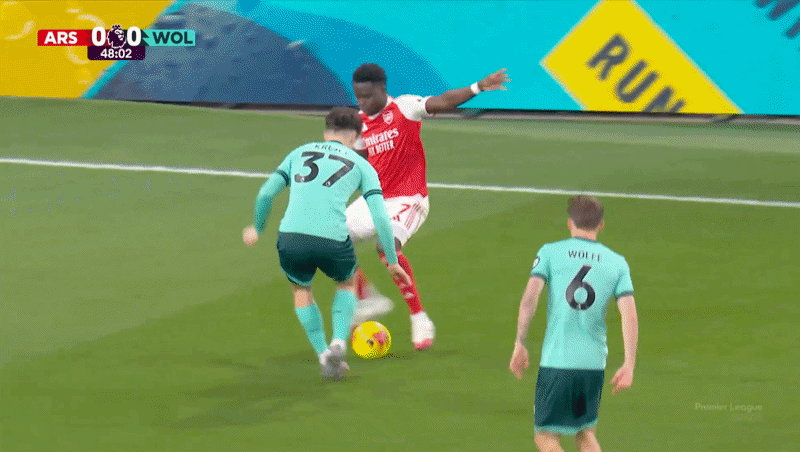 في المرة الثانية، من الفوز 2-1 على أرضه على ولفرهامبتون واندررز في ديسمبر، في الدقيقة 48، مرر بوكايو ساكا، الذي كان يتمتع برقابة مزدوجة، من خلال الظهير الأيمن جوريان تيمبر في الجزء السفلي من الملعب.
