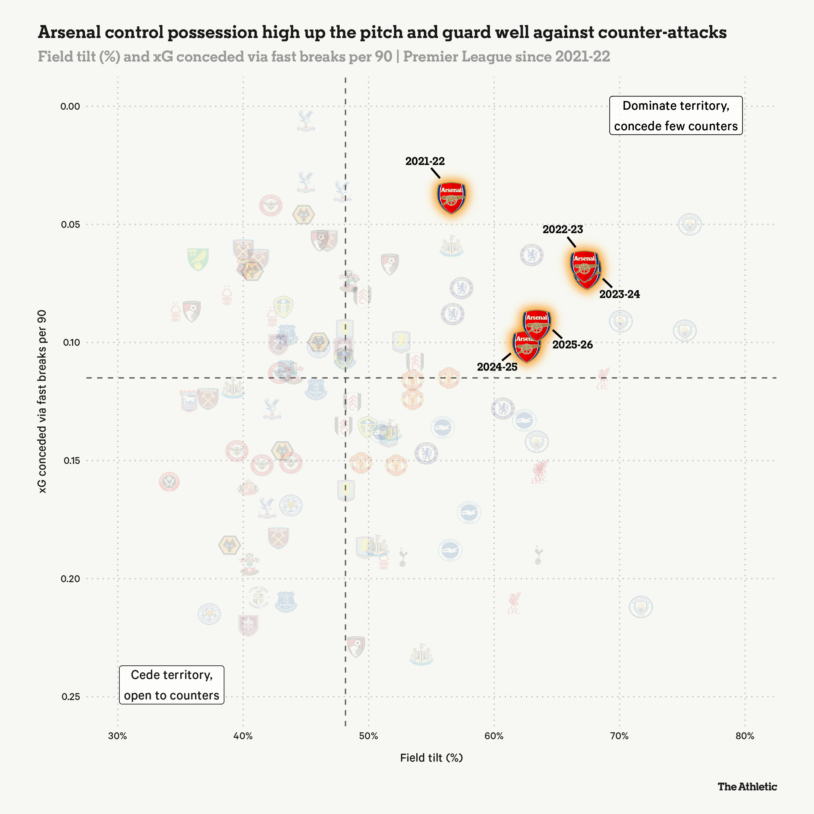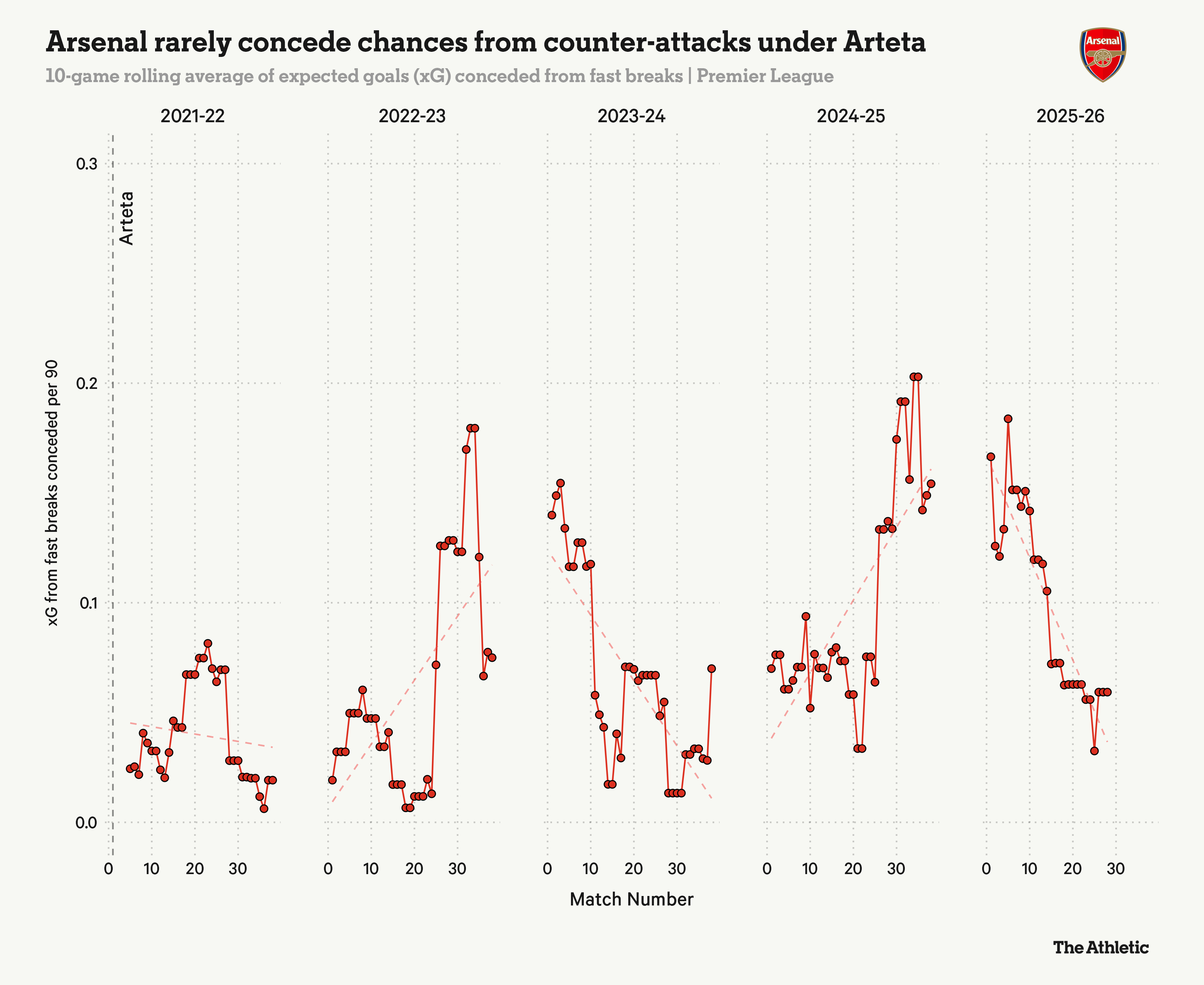 بشكل حاسم، من منظور دفاعي، هذا هو أفضل تكرار لأرسنال تحت قيادة أرتيتا عند النظر إلى جودة فرص الهجمات المرتدة التي يتلقاها الفريق.
