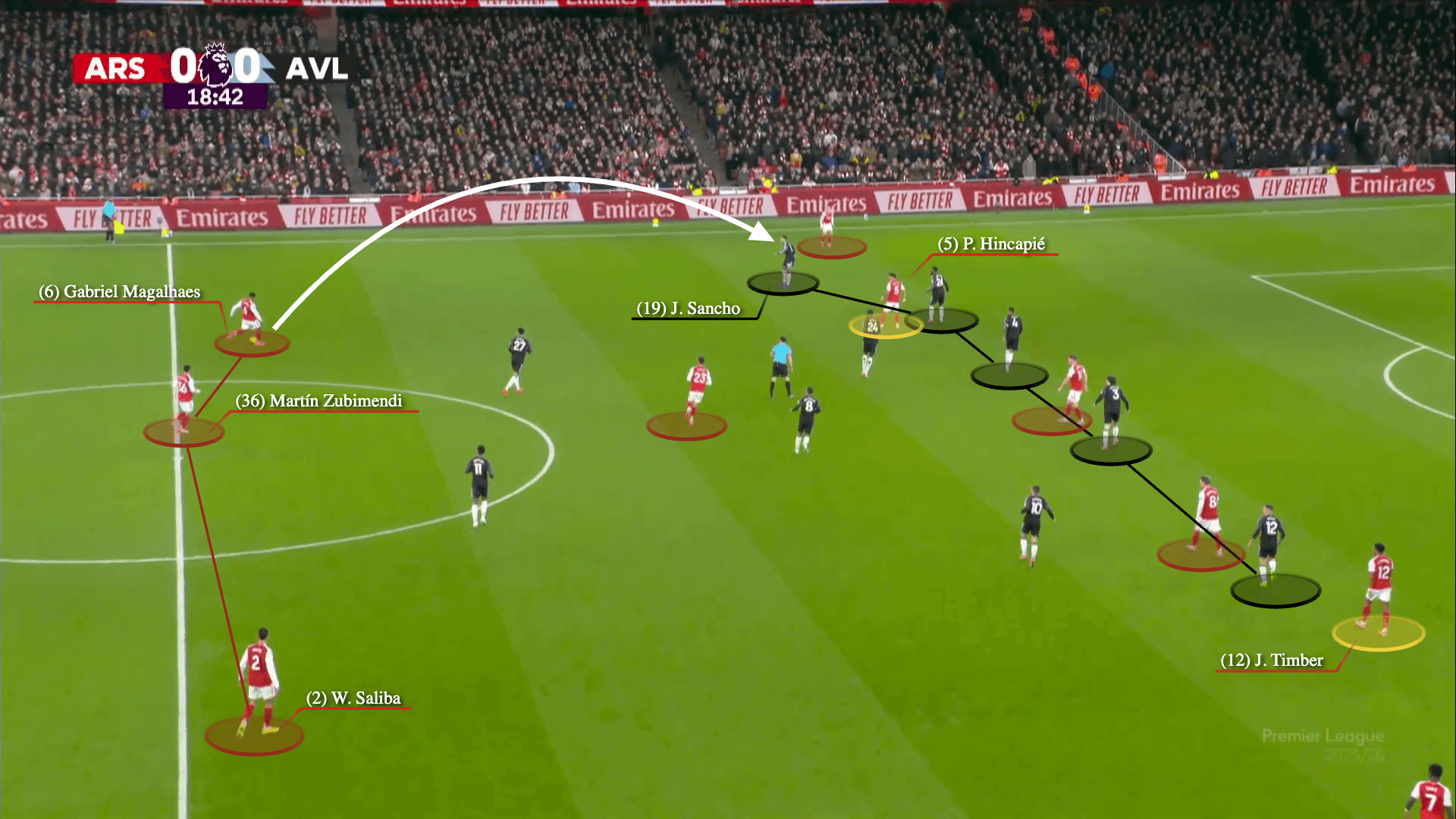الظهيران بييرو هينكابي وتيمبر (النقاط الصفراء) موجودان في الخط الأخير، بينما يبني أرسنال تشكيلته 3-1-6. وتراجع لاعب الوسط مارتن زوبيميندي بين صليبا وغابرييل، مما سمح لقلبي الدفاع بالانقسام. ميكيل ميرينو هو المحور الوحيد. انخفض فيلا إلى 5-3-2 لاحتواء مضيفيهم.