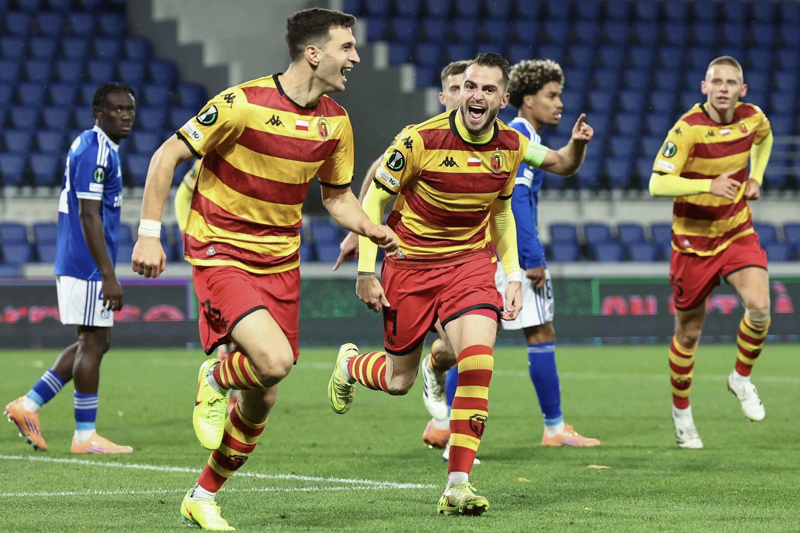 لاعبو جاجيلونيا بياليستوك يحتفلون بهدف في مرمى ستراسبورج في دوري المؤتمرات الأوروبي (فريدريك فلورين/ وكالة الصحافة الفرنسية عبر غيتي إيماجز)