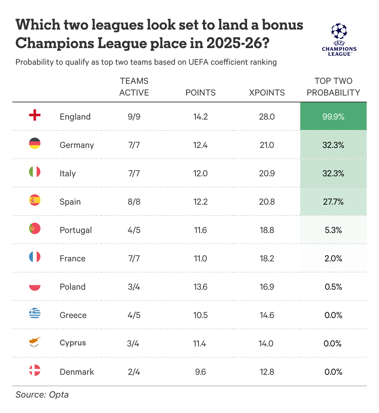 باستخدام نموذج قوة الفريق للتنبؤ بنتائج المباريات، تبحث Opta في احتمالية حصول كل فريق على نقاط من الانتصارات والتعادلات والتقدم حتى نهاية الموسم، مع تقدير عائد النقاط المتوقع بمجرد تقسيم إجمالي النقاط على عدد الفرق المتنافسة في أوروبا لهذا الاتحاد.