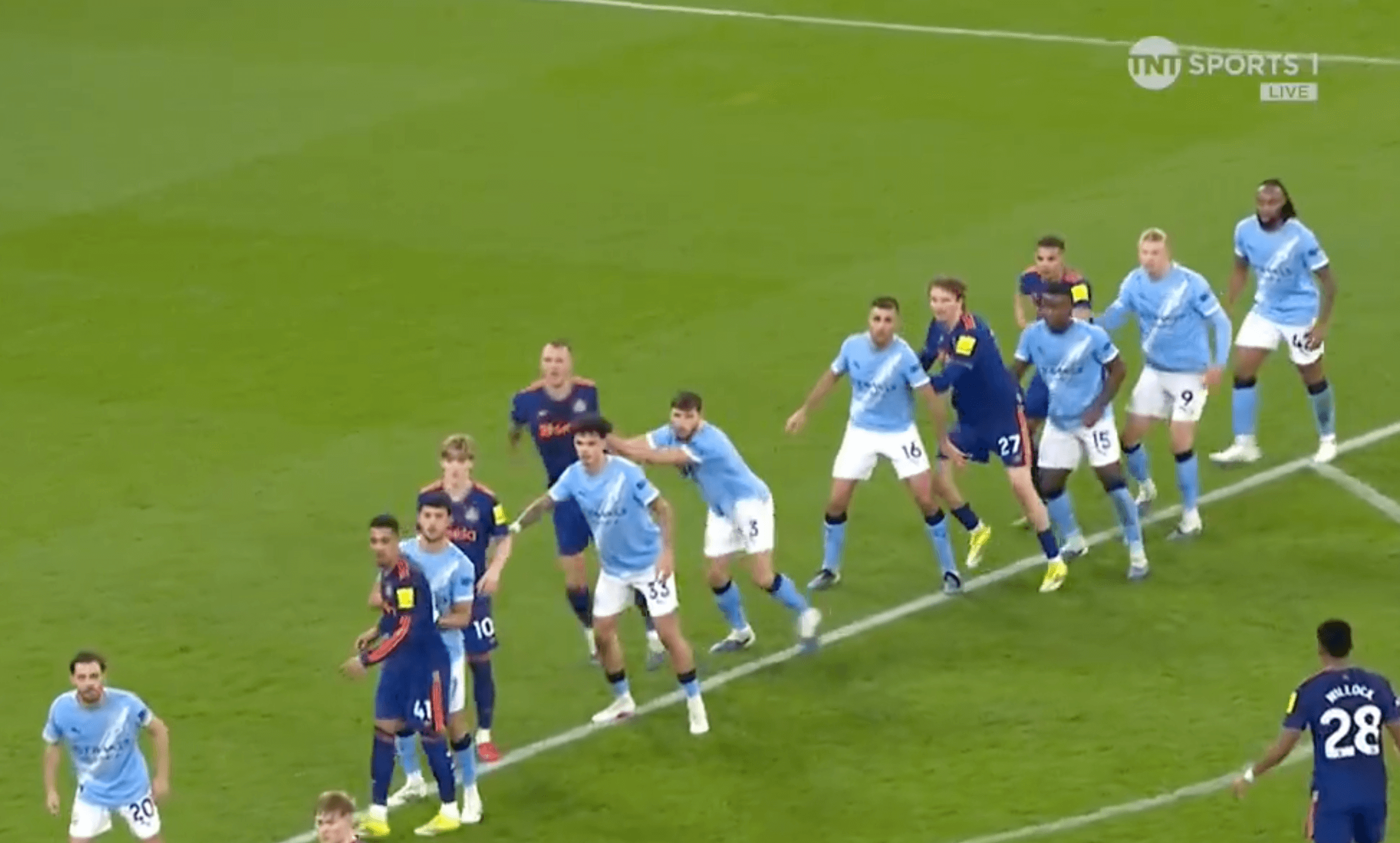 تبع بيرن هالاند حول الملعب، وتم حجزه مبكرًا بسبب تصارعه مع المهاجم، بينما كان هول يتتبع أنطوان سيمينيو ونيك وولتيماد كان عادةً يلاحق برناردو.