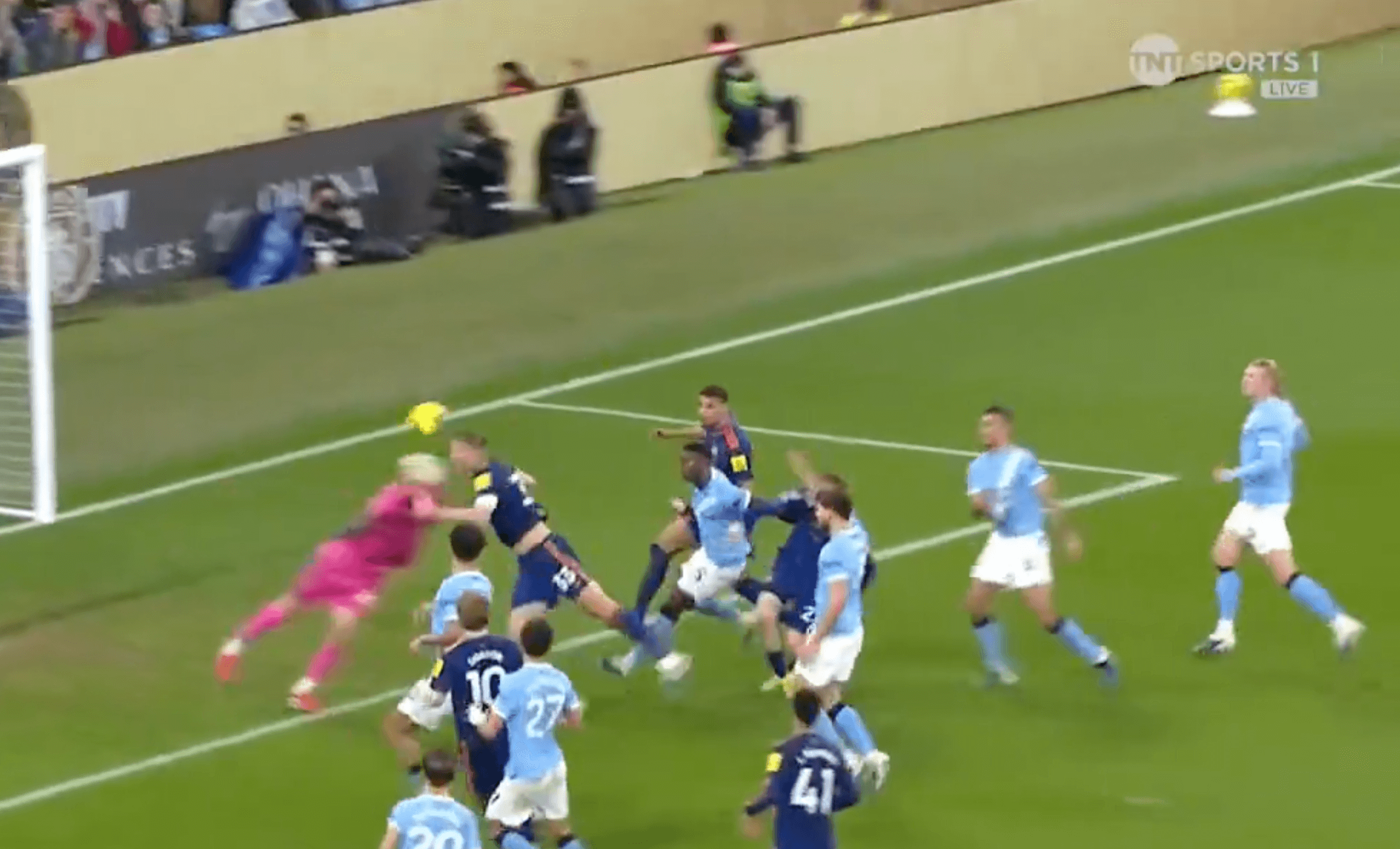 تم رفع علم التسلل وكان قلب الدفاع أمام خط دفاع مانشستر سيتي بشكل هامشي عندما تم لعب الكرة. ومع ذلك، يبدو أن روبن دياس دفع بيرن إلى موقع التسلل، حتى لو كان موقفه الأساسي خلف الدفاع بالفعل.
