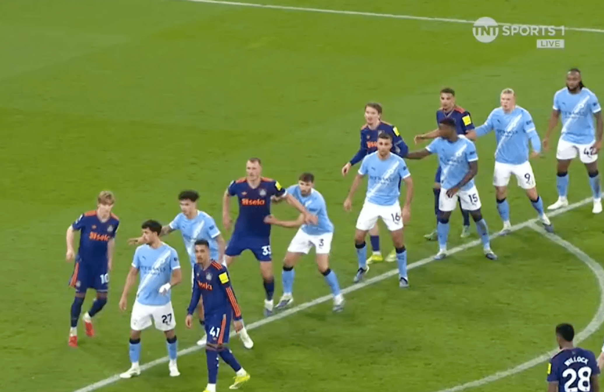 تبع بيرن هالاند حول الملعب، وتم حجزه مبكرًا بسبب تصارعه مع المهاجم، بينما كان هول يتتبع أنطوان سيمينيو ونيك وولتيماد كان عادةً يلاحق برناردو.