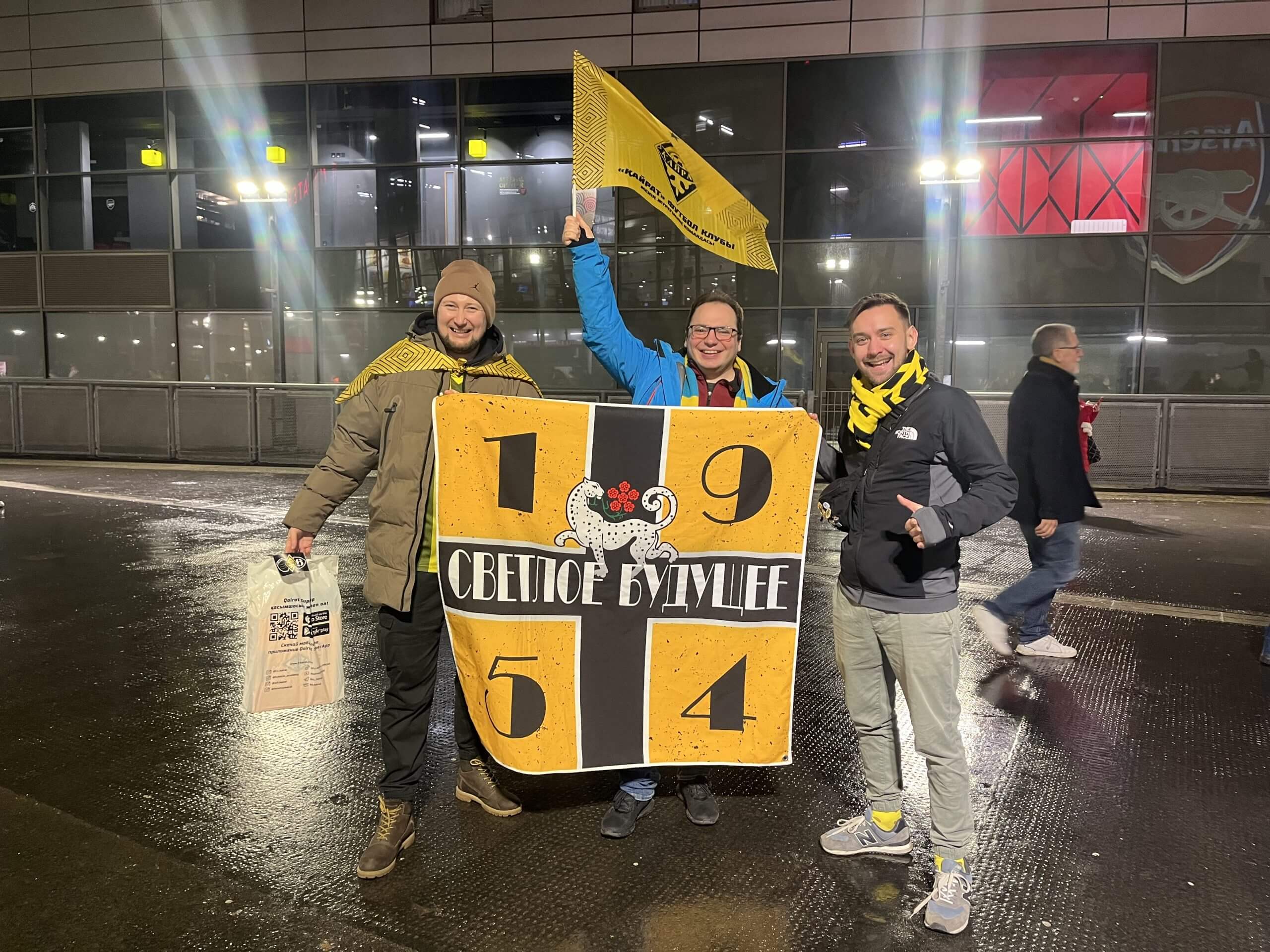 بعض الكازاخستانيين هنا ليسوا من أنصار كيرات، وبعضهم ليسوا في العادة من المتابعين المتفانين لهذه الرياضة. لتجهيز اللاعبين المبتدئين، قام عدد قليل من مشجعي Kairat المخضرمين بإنشاء “متجر نادي” مؤقت مقابل متجر Armory الخاص بنادي آرسنال. وفي وسط دوار على طريق هورنسي القريب، كانوا يبيعون قمصان الفريق الصفراء والسوداء، بالإضافة إلى أعلام كازاخستان المصغرة.